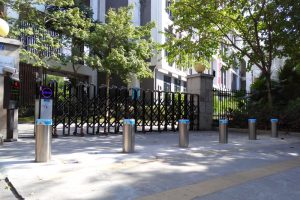 为防止车辆的非法闯入,可在变电站大门通道上安装升降柱路障来防止非法闯入,现在变电站这种需要高安全的单位不是采用道闸系统,因为道闸毕竟是安装在地面上的,有一定的阻碍作用但是汽车还是可以强行撞杆进入,而且影响现场的美观,这样就需要安装升降柱路障。液压升降地柱配合车辆进出管理系统,系统采用成熟的液压技术,将低频射频技术、电子技术、液压技术和机械完美地相结合,具有坚固、可靠、抗冲出、反应速度快等特点,适用于对车辆进出管制严格的区域。平时升降柱为上升状态,阻止车辆进入,当携带合法卡的车辆进来时,自动降下升降柱,并同时打开大门,允许车辆进入。如果非法车辆强行闯入,则会被升降柱阻拦,可以配合监控抓拍、录像、报警功能给与警告和犯罪记录。